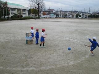 段ボールめがけて、ボールけり。うまくたおせたかな?