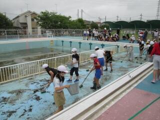 来週のプール開きに向けて、5・6年生がプール清掃をしました。