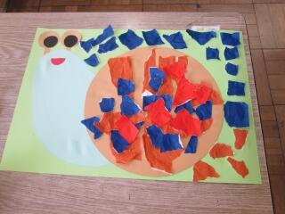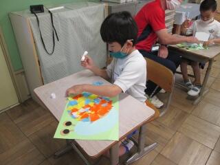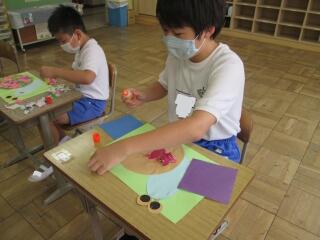 絵を描いて彫刻刀で彫って、色を塗ります。