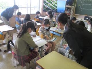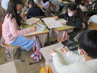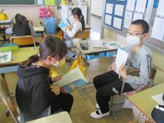 5年生の算数では、自分の考えを隣の子に伝えていました。