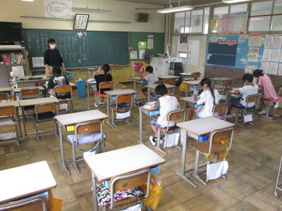 緊急事態宣言の解除で、全校朝会が体育館でできました。密に気を付けて、間隔をあけての集会です。