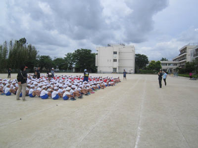 今朝は、昇降口から不審者が侵入してきたと仮定して避難訓練を行いました。