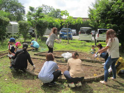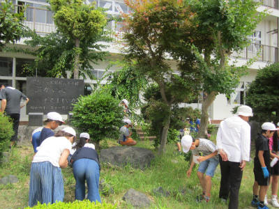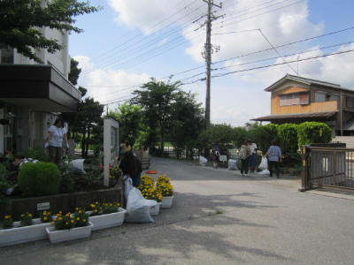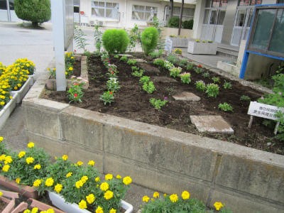 中庭には、子供たちが育てた豊野小のシンボルのコスモスの種を植えました。