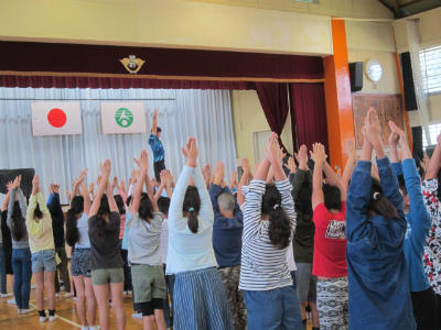 雨が心配なので、今朝のさわやかタイムは、教室で放送によるストレッチです。