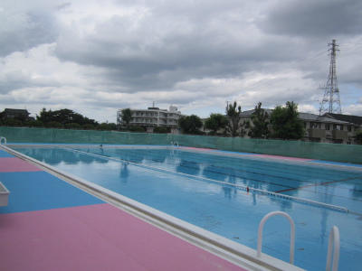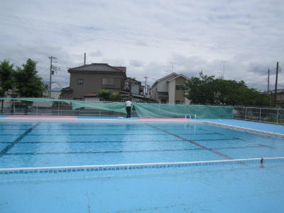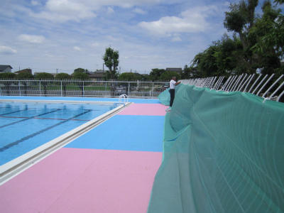 水泳学習に備えて、プールの回りに目隠しのシートを貼りました。