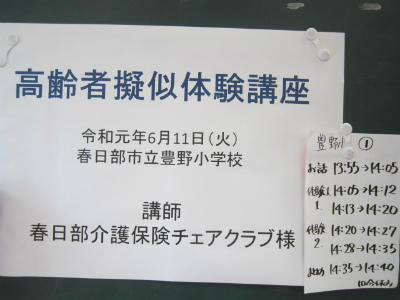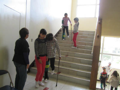 6年生が、コスモスの学習(総合的な学習の時間)で、講師の方たちを招いて、高齢者疑似体験を行いました。