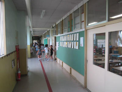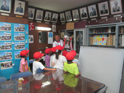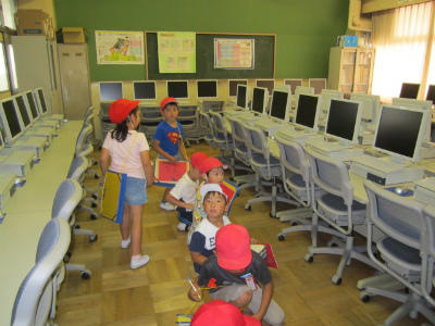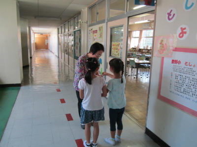 1年生の学校たんけんです。自分たちで探検するので、きょろきょろしながら、校舎内を回っています。