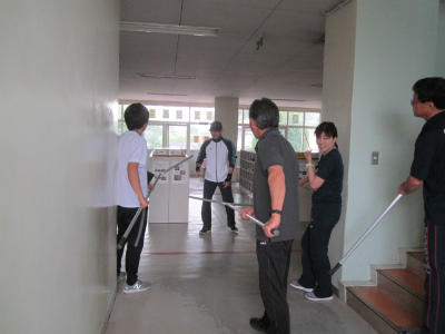 放送を聞いて駆けつけた職員が、不審者役をなだめながら、追いやっています。