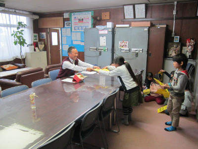 豊野地区の見守り隊から、通学班長・副班長として活躍してくれた6年生の卒業を祝って、ガーベラをいただきました。