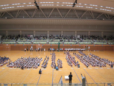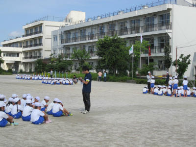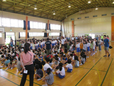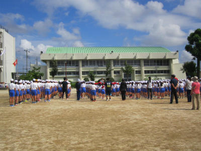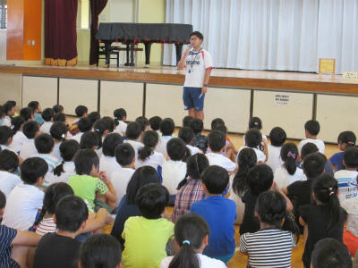全校児童の前で、選手によるリレーです。応援態度も立派でした。