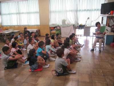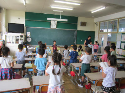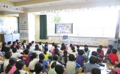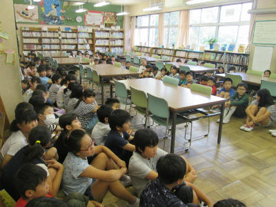 6月の全校朝会は、「あいさつ」を取り上げた本を校長がスライドを使いながら読みました。