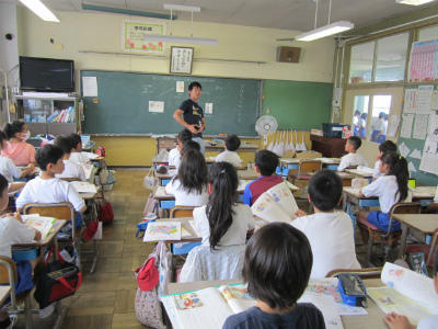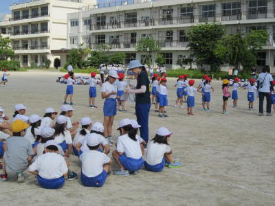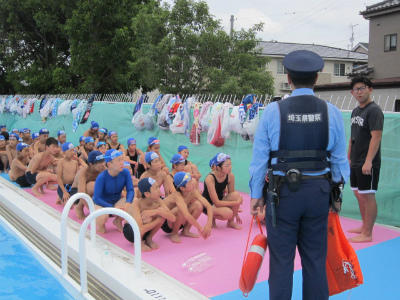 今日は、6年生が着衣水泳を行いました。特別に、富田警部補が水難事故防止についての指導もしてくださいました。