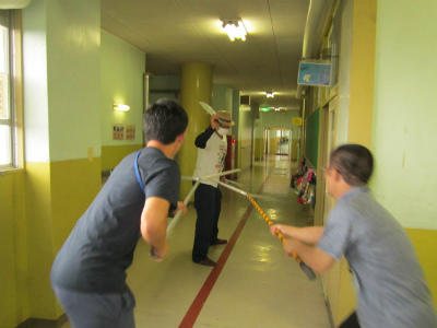 業前の時間を使って、今年も竜巻を想定して避難訓練を行いました。