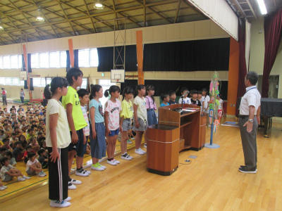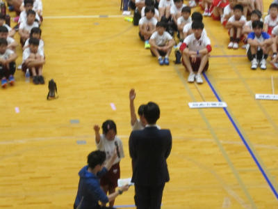 今朝の表彰朝会は、市内陸上大会などの体育関係です。