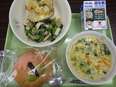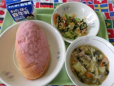 ミートピザ、コンソメスープ、グリーンサラダ、ツイストパン、そして牛乳をおいしくいただきました。