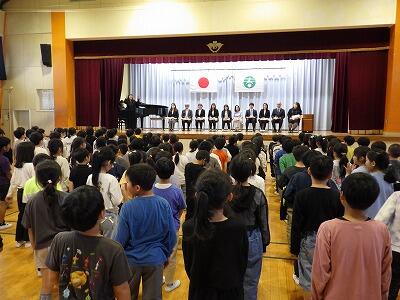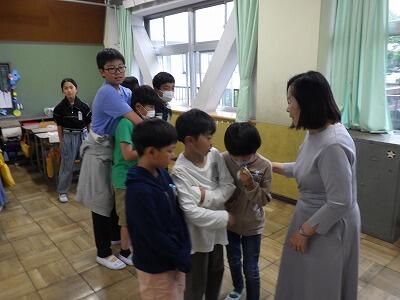 昇降口前には4年生の元気な声が響いています。