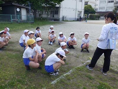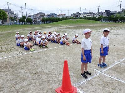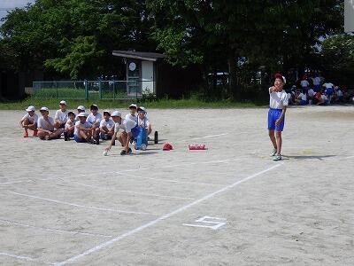 1年生の体力テストは6年生が手伝ってくれます。