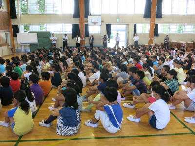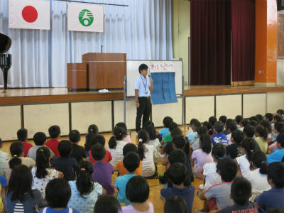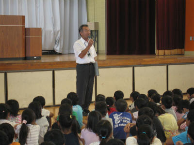 今月の生活目標の「あいさつ」の話を聴いています。「めざせ、日本一のあいさつ」。