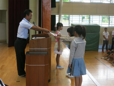 校長から、コスモス賞(校長賞)を受け取る3人の児童です。