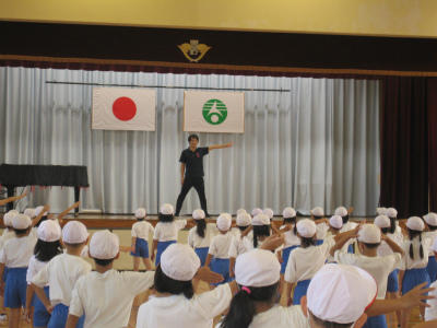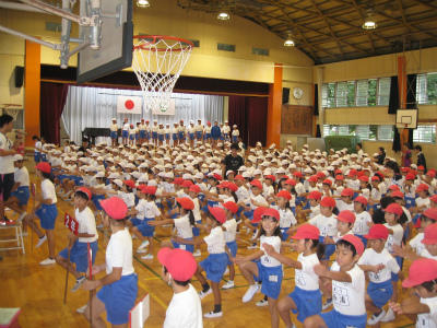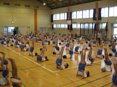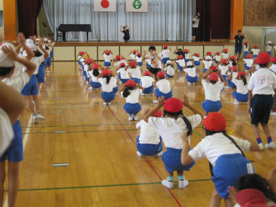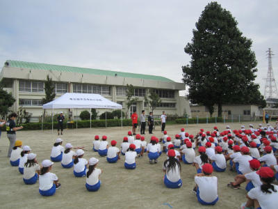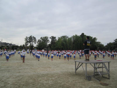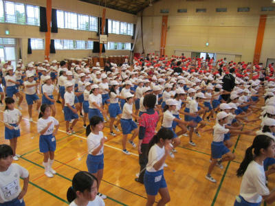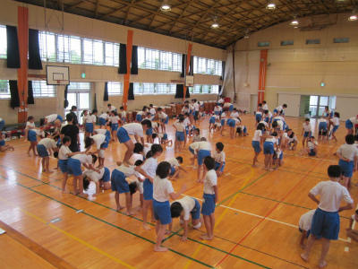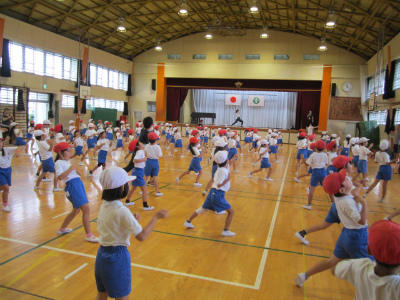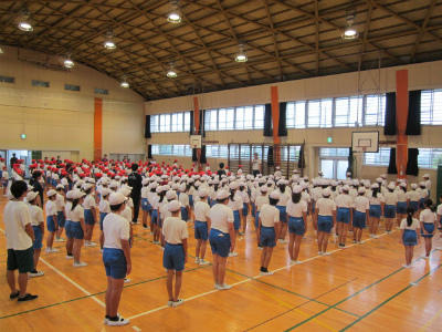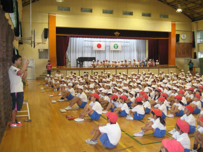 雨のため、今日の練習は、体育館の中でした。それでも、子供たちは一生懸命、先生の話を聴いて練習していました。