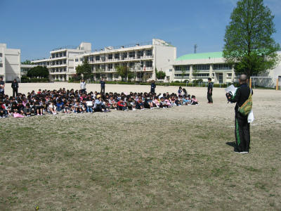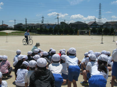 1年生の交通安全教室を校庭で行いました。「道路の安全な歩き方」について、富田警部補はじめ、春日部警察、交通指導員、春日部市役所の10名の方々から、ご指導いただきました。みんな真剣そのものでした。
