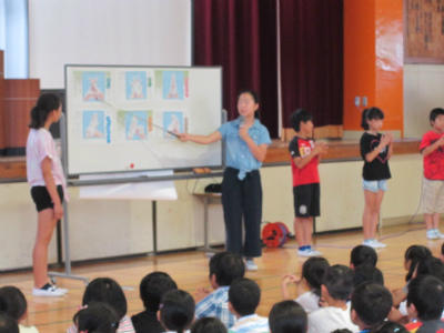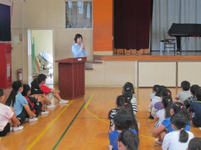 校長先生から、本の読み聞かせがありました。自分の「いのち」は勿論、友達、家族みんなの「いのち」を大切にすること。そのためには、「自分勝手」や、「意地悪をしない」、そして「ずるをしない」ことなどについて話がありました。