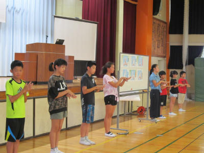 6月1日に、幸松小学校で行われる陸上大会の壮行会を行いました。豊野小学校の代表として一人ずつ紹介されています。