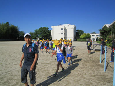 子供たちががんばった陸上大会の様子です。応援児童の出発です。