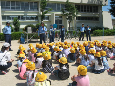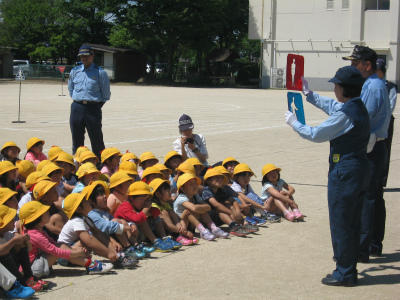 信号機の秘密や安全な道路の渡り方など、警察官の富田さんの話に、子供たちは真剣そのものです。