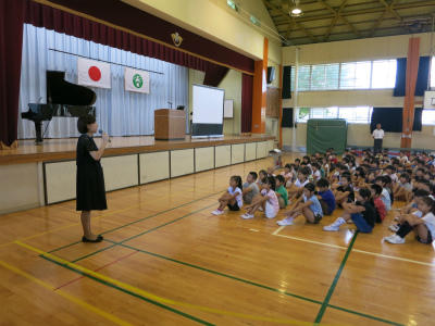 校長先生からは、よわい心とつよい心についての話がありました。弱い心に打ち勝ち、やさしい心・がんばる心を持った強い心に育ってほしいと話し、児童もしっかりと聞いていました。