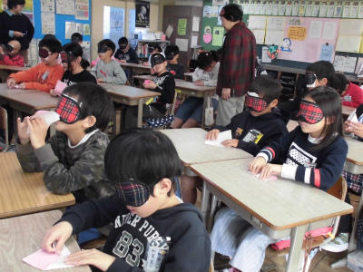 4年生は福祉について学習しています。今日は、ゲストティーチャーをお招きしてアイマスク体験をしました。アイマスクをして折り紙を折るなどの活動をしました。学習を通して、目が見えないことの大変さを学びました。また、自分で目が見えない方に何ができるかを考える機会となりました。これからは手話体験や車いす、展示の体験学習を行います。