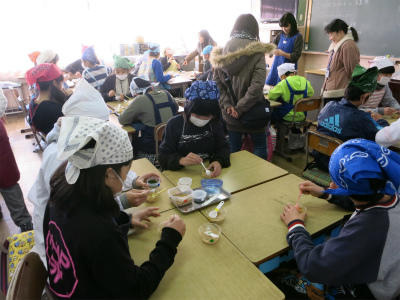 予定より30分以上も早い昼食です。安心したのか、おかわりする子供もたくさんいます。