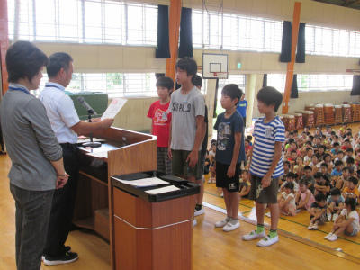 表彰朝会 投稿日時 : 2018/07/11 豊野小 カテゴリ: 今朝の表彰朝会は、市内陸上大会などの体育関係です。各種目の1位から6位までの入賞者です。リレーの表彰です。市民体育祭スローガンコンクールの表彰です。来年は、豊野小学校が会場です。3年生以上は、中心選手としてがんばりましょう。
