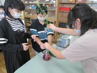 6年生 理科「植物の養分と水」 投稿日時 : 2020/07/15 豊野小学校管理者 カテゴリ: 「植物は、水をどこから取り入れる?」 「あさがおは、土に水をあげた。だから根だ」 「では、水は根からどこを通ってどこに行く?」 赤い色水を植物に吸わせて、水の通り道を調べる実験です。 赤く染まったところが、水の通り道だね。