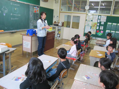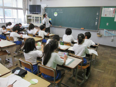授業の初めに、ゲストテーチャーの校長からお願いが・・・。「豊野小学校を紹介するすてきな〇〇を作ってください。」