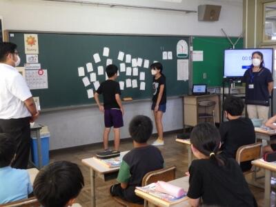 5年生 外国語 投稿日時 : 2023/09/06 編集長 カテゴリ: 何をやっているのでしょう。 数字の書かれた紙を2枚めくります。 合計が31になる組み合わせを探します。 数を確認し、合計した数を求めるやりとりを、すべて英語で行います。
