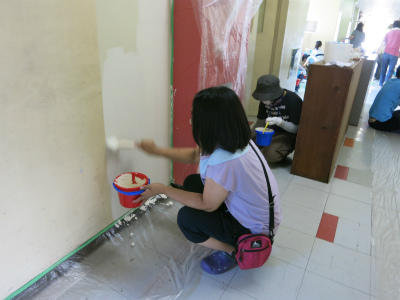 豊野小学校リフレッシュ大作戦③ 投稿日時 : 2017/07/21 豊野小 カテゴリ: まだまだ続きます。黙々と・・・。脚立に乗って、高いところも。手際のよさに、予定に無かった階段まで塗りました。すごいです!