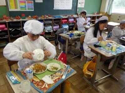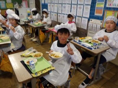 給食の時間(4年生) 投稿日時 : 2023/06/02 編集長 カテゴリ: もうすぐ配膳が終わります。 食缶の中のチキンカレーです。 いただきます。 昨日はお弁当の日でした。 お弁当もカレーライスもおいしいですね。