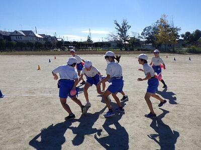 6年生 タグラグビー(体育) 投稿日時 : 2024/11/07 編集長 カテゴリ: 3時間目の校庭は、強い風が吹いていました。 6年生がタグラグビーの試合をしていました。 作戦会議。 ボールを持っている人が相手にわからないようにします。 チームワークと作戦が勝敗を左右します。