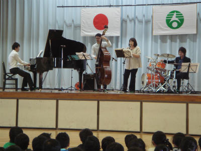 今日は、音楽鑑賞会が行われました。クラリネットの川畑麻衣子様、ピアノの佐合庸太郎様、ドラムの坂本暁良様、コントラバスの古賀圭侑様の4名をお迎えし、プロの演奏を子供たちは鑑賞することができました。