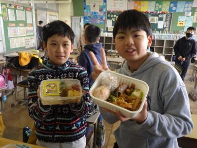 まだ朝の会が始まる前ですが、5年生が今日のお弁当を見せてくれました。