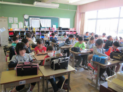 3年生、初めての書写(習字)です。道具の使い方を学んでいます。
