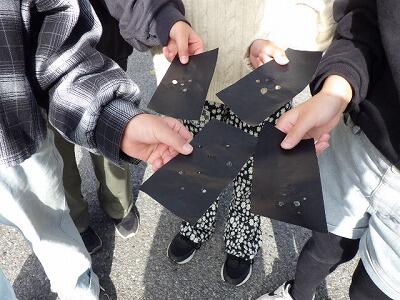 3年生 理科 投稿日時 : 2024/11/08 編集長 カテゴリ: 太陽光を虫メガネのレンズで集める実験です。 みんな、じっと静止したままです。 光の点が動かないようにします。 焦げくさい匂いがして、黒い折り紙に穴が開きました。 3年生の理科の実験は、シンプルで楽しいものが多いですね。