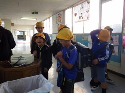 昇降口で、お囃子の音が子どもたちを迎えます。