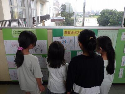 運動会ポスター・応援団 投稿日時 : 2024/10/03 編集長 カテゴリ: 2階の渡り通路に、アートクラブの児童が描いたポスターが掲示してあります。 2年生が集まって鑑賞していました。 今日も昼休みに応援係が練習していました。 日に日に応援の声が力強くなってきました。