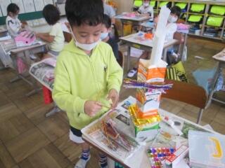 1年生 図工「うきうきボックス」 投稿日時 : 2020/07/17 豊野小学校管理者 カテゴリ: 「見て見て!ワニを作ったよ」 「ぼくはライオン」「わたしはネコ」 箱の形や色から想像して飾り付けたら、変~身! 楽しそうに見せ合っていました。