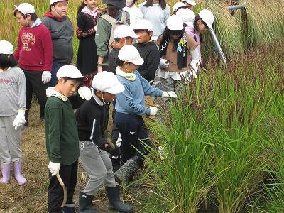 5年生が、田植えをした赤沼の田んぼで、稲刈りを体験させていただきました。