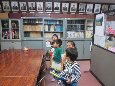 1年生の学校探検(校長室) 投稿日時 : 2017/06/13 豊野小 カテゴリ: 1年生の学校探検が、校長室や保健室、職員室をはじめ、校舎内全部で行いました。前回とは違い、1年生だけの5人のメンバーでの探検です。校長室の探検の様子です。元気にあいさつあいさつも質問も見学もしっかり行っていました。校長室で発見したこと、クラスのみんなに伝えてね。