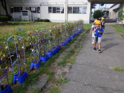 夏休みが終わり、アサガオの鉢が学校に戻ってきました。