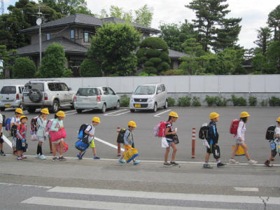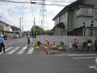 交通量が多い道路です。交通指導員さん、保護者のみなさん、ありがとうございます。